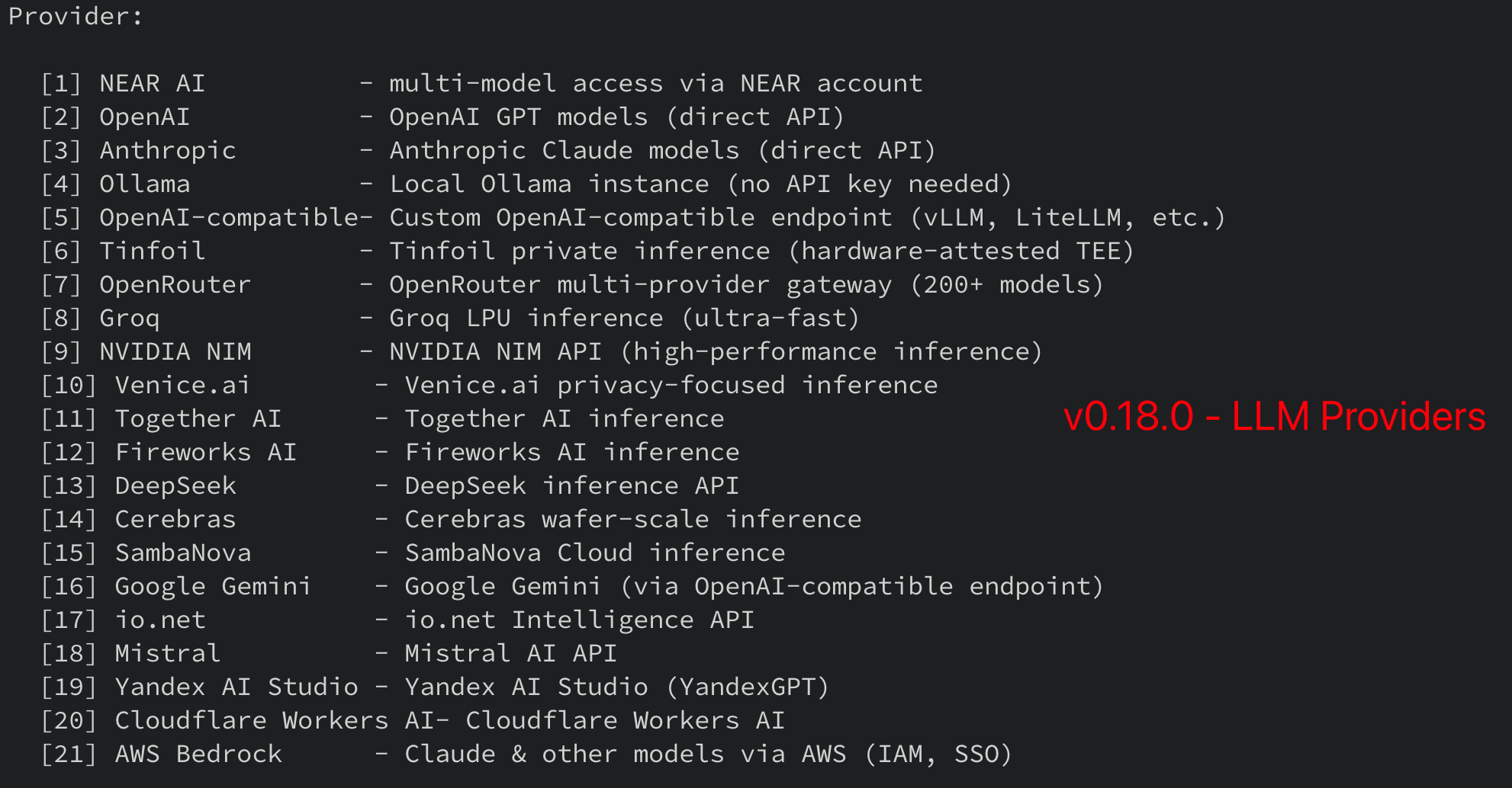 之前写过一篇名为 IronClaw 安全机制解析 的文章,简单介绍了 IronClaw 的安全机制。当时 IronClaw 还处在 v0.18.0 版本,在它支持的 LLM 列表里只有 DeepSeek 一家是国内的(见下图)。写这篇文章的时候,IronClaw 来到了 v0.21.0 版本。