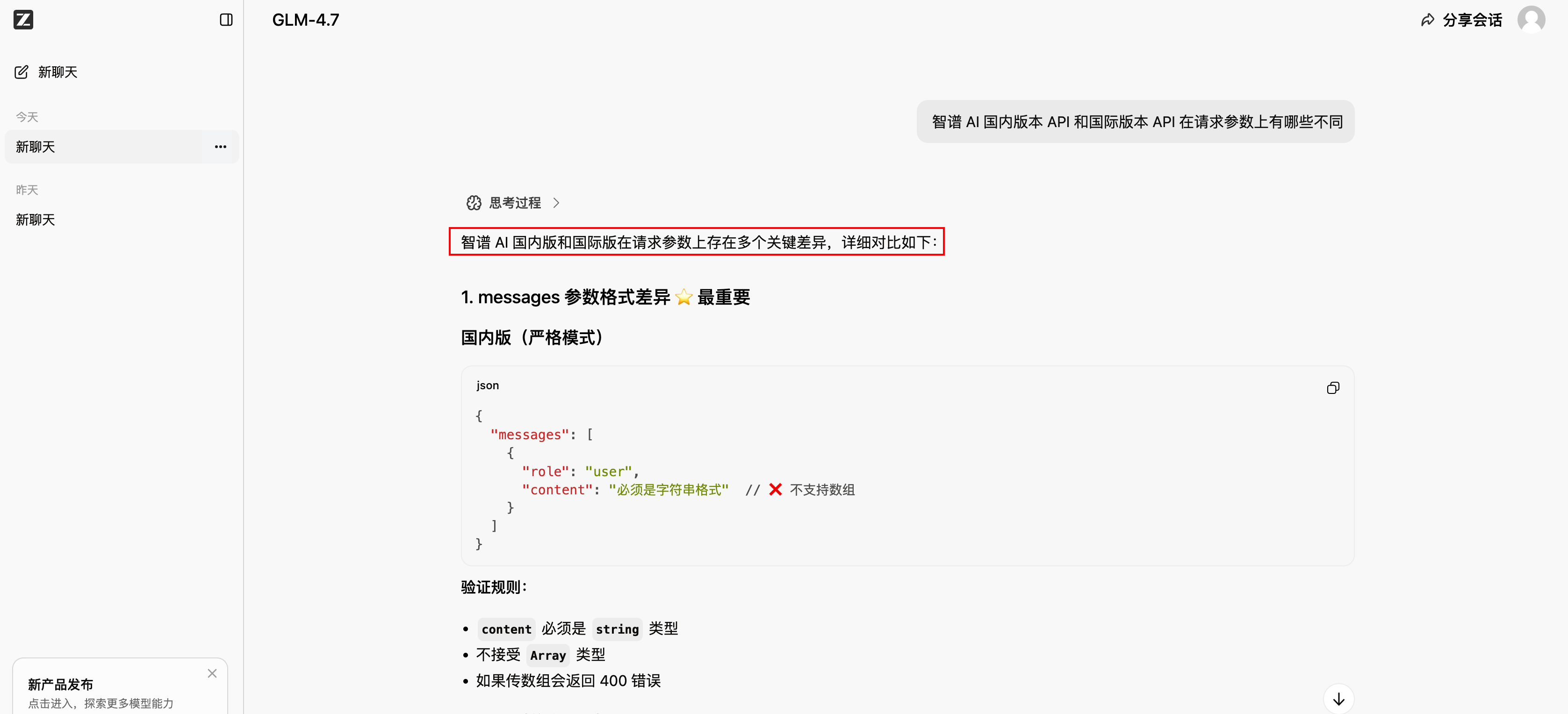 既然官方文档上没有给出有价值的信息,那只好抱着“死马当活马医”的态度去问问 智谱 AI Chat。问:“智谱 AI 国内版本 API 和国际版本 API 在请求参数上有哪些不同?”,回答:“请求参数上存在多个关键差异”。