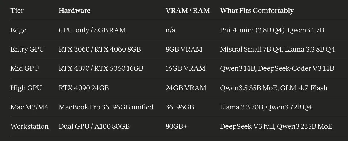 - 硬件:RTX 4060 8GB (Small 3) → RTX 4090 24GB (Mixtral 8x7B)